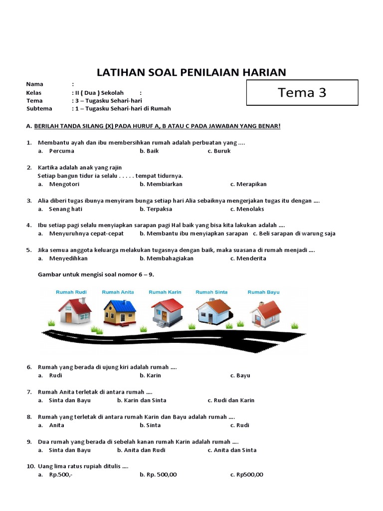 Pembelajaran di Sekolah Dasar, khususnya pada jenjang Kelas 2, dirancang untuk membekali siswa dengan pemahaman dasar yang kuat mengenai berbagai aspek kehidupan. Salah satu tema yang sangat relevan dan dekat dengan keseharian anak adalah Tema 3: Tugasku Sehari-hari. Tema ini tidak hanya mengenalkan konsep-konsep penting, tetapi juga mendorong siswa untuk mengaplikasikan pengetahuan mereka dalam konteks nyata. Latihan soal menjadi instrumen krusial untuk mengukur pemahaman siswa dan memperkuat konsep yang telah diajarkan. Artikel ini akan mengupas tuntas mengenai berbagai jenis latihan soal yang dapat dihadapi siswa Kelas 2 dalam Tema 3, serta memberikan panduan bagi orang tua dan pendidik dalam memfasilitasi proses belajar.